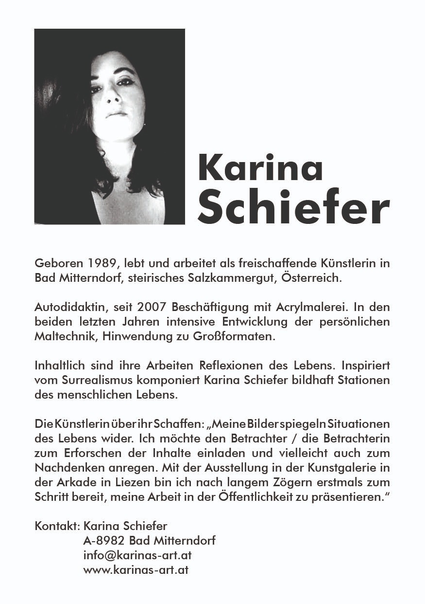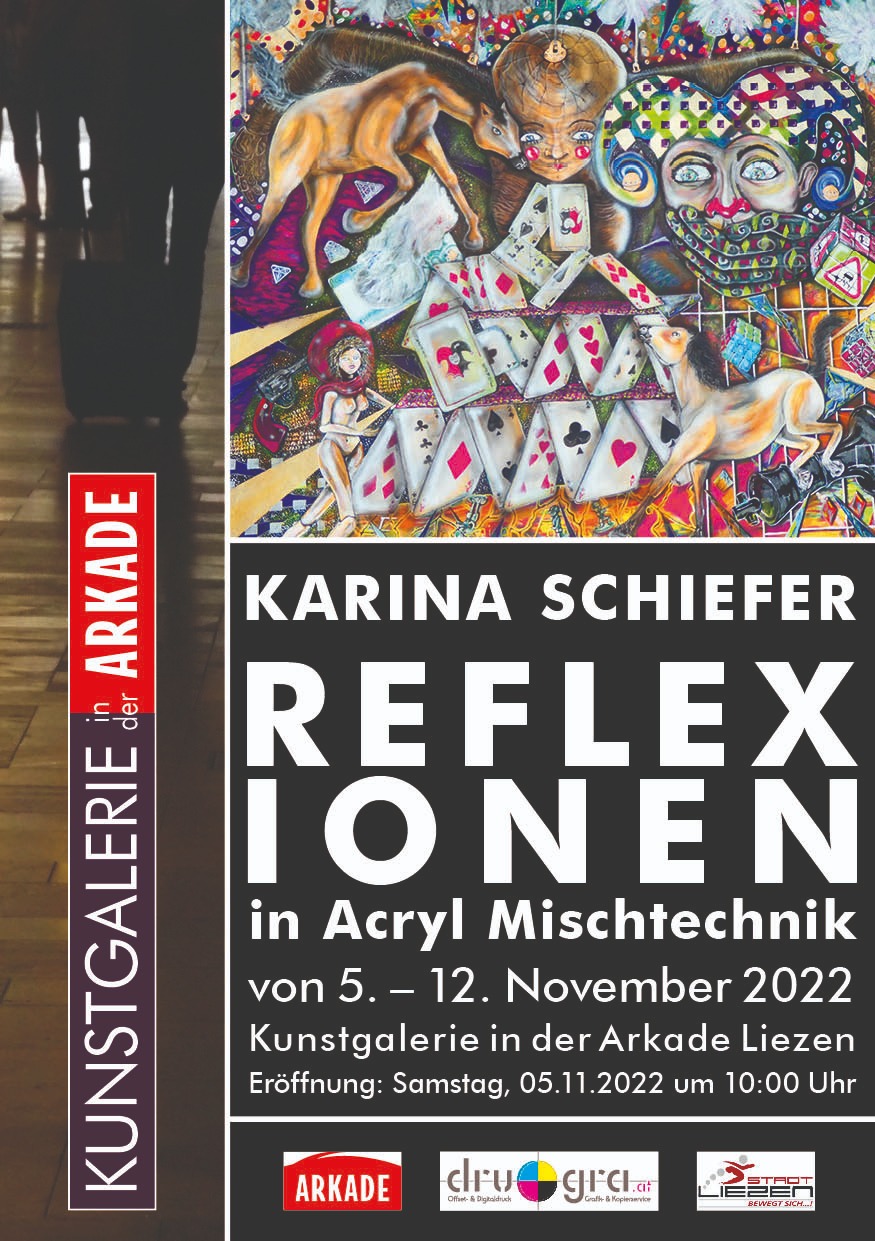 Am 5. November stellt sich eine einheimische Künstlerin in der Kunstgalerie in der Arkade vor. KARINA SCHIEFER aus Bad Mitterndorf zeigt erstmals ihre großformatigen Kunstwerke in der Öffentlichkeit. Die Originale werden nur eine Woche hängen.